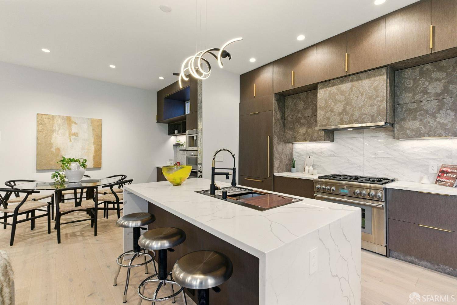 Modern Luxury in Eureka Valley/Dolores Heights. Welcome to this spacious, designer-remodeled 3-bedroom, 2.5-bath condo spanning two levels in the heart of Eureka Valley. Blending style and function, this home offers a refined urban lifestyle just steps from vibrant Castro dining and entertainment. The open-concept main level features a chef's kitchen with high-end Thermador appliances, generous cabinetry, and a large island with counter seating ideal for hosting. Adjacent, the dining area boasts a sleek wet bar complete with a built-in coffee maker and wine cooler. A custom entertainment center with faux Venetian marble anchors the living room. 2 bedrooms and 1.5 baths complete this level. The spacious primary suite opens to a private patio and features a walk-in closet and spa-inspired ensuite bath with dual vanities and a walk-in shower. Lutron smart home systems, European white oak floors, and multi-zone radiant heating bring comfort and convenience. Enjoy peace and quiet with sound-dampening upgrades, including double drywall, enhanced insulation, and double-pane Marvin windows. Relax outdoors in the low-maintenance yard or retreat to the balcony. Walk Score: 98 - unbeatable access to public transit, parks, cafs, nightlife, and more.