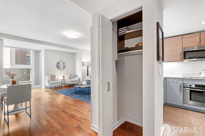 Modern comfort & sophisticated city living await in this serene residence at The Palms, offering the perfect balance of elegance, convenience & style in the heart of South Beach. The welcoming entry features two custom-organized closets & wood floors that flow into a bright, open living area framed by floor-to-ceiling windows and a private patio, an inviting retreat for morning coffee or evening relaxation. The chef's kitchen delights w elegant tile flooring, high-end Bosch SS appliances & generous cabinetry, while the oversized bedroom exudes tranquility w designer wallpaper, plush new carpet, an upgraded closet system, and an integrated office nook illuminated by natural light. The beautifully finished bathroom offers a spa-inspired design complemented by an in-unit W/D w additional storage. A premium parking space on the third floor, valued around $53K & free of $300 mo parking fees, is included. Residents enjoy resort-style amenities including 24/7 concierge and security, a fitness center, yoga studio, 20-seat theater, and an elegant owner's lounge with low HOA dues. Ideally situated near the Embarcadero, Caltrain, Whole Foods, and San Francisco's best dining and entertainment, this turnkey home also offers the option to purchase furnishings for a seamless move-in experience