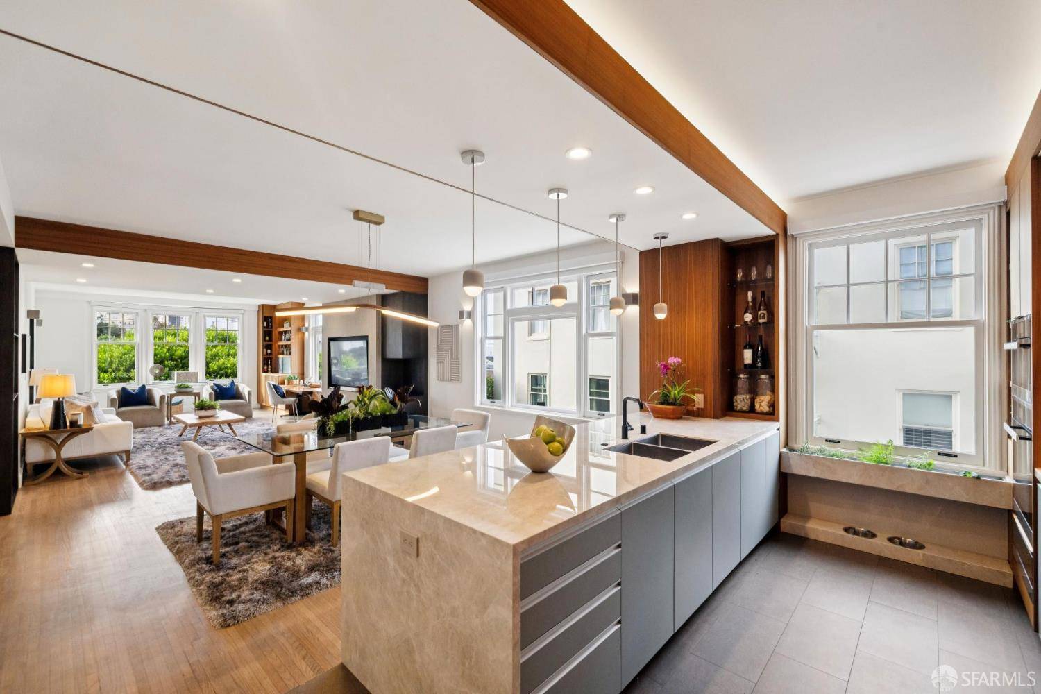 Newly-renovated & rarely-available 2-bedroom / 2-bath / 2-car parking condominium with top-of-the-line finishes & Golden Gate Bridge views is now available! Located in elegant Mediterranean-inspired Pacific Heights building with on-site manager & in-unit washer/dryer, this condo seamlessly blends old-world charm with modern conveniences! Epicurean Kitchen is both functional & beautiful, featuring large stone peninsula for casual dining or entertaining, Miele appliances, double oven, Wolf induction range, full-size temperature-controlled beverage refrigerator, walk-in pantry, abundant storage, & luxurious walnut cabinetry with accents. The spacious Living/Dining Area includes an eco-friendly fireplace that simulates flame with light & air, room for a large dining table, custom walnut built-ins with accent lighting & generous walnut uplift desk for sitting or standing. A picture window above the desk frames quintessential Golden Gate Bridge view. Two, large bedrooms & spa-like bathrooms offer retreat-style comfort. Primary Bathroom features a deep Florou soaking tub with marble, back-lit panels, heated floors, & premium finishes throughout. Custom, walk-in closets complete the condo! Common area: Posh lobby, 2 elevators, roof w/ 360-degree views of GG Bridge, Mt. Tam, Salesforce!