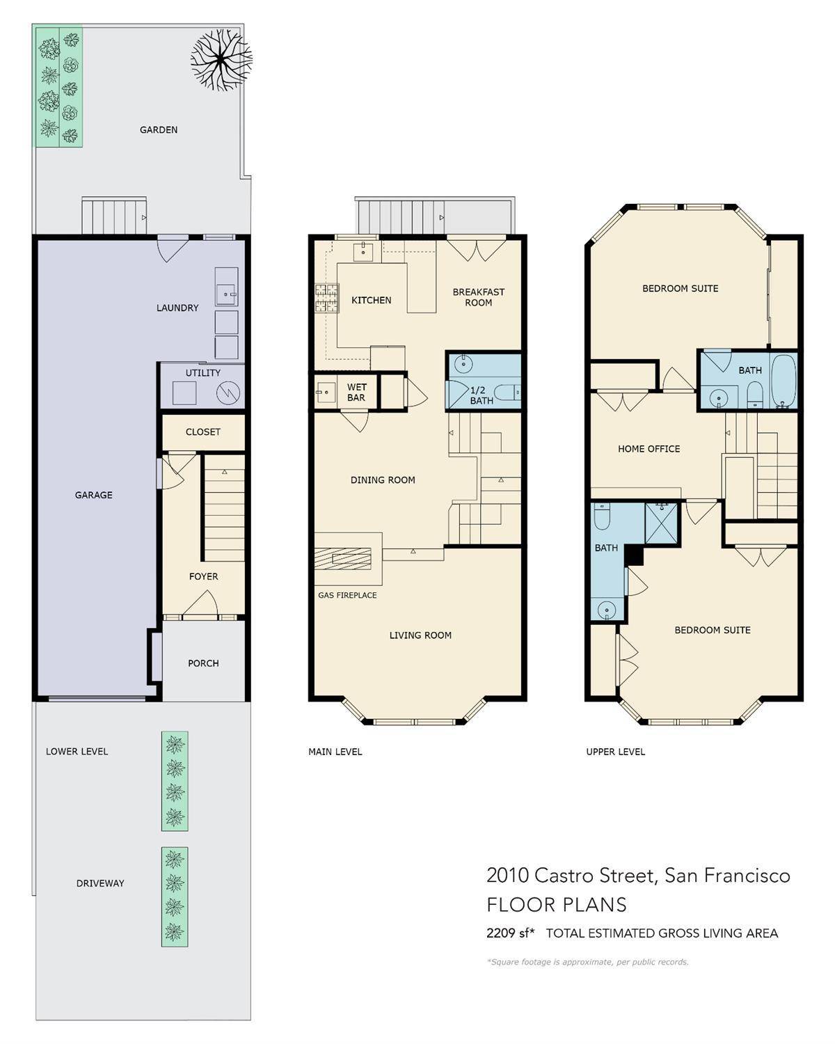 One might think of Castro Street as hilly, noisy, or bustling. Yet one special block in Noe Valley is a well-kept secret: quiet, accessible, level, and uncrowded, with views of the neighborhood and the city, plus easy access to shops, Diamond Heights, parks and schools. This elegant Noe Valley townhouse lives like a single-family home, offering space, privacy, and comfort. Upstairs, two spacious ensuite bedrooms filled with natural light serve as peaceful retreats, separated by a bright loft with skylights ideal as a reading nook, office, or creative space. Enjoy panoramic downtown views to the front, rolling hills and city lights to the rear. The main level features a sunken living room with a gas fireplace, a formal dining room with a bar closet, and a cheerful eat-in kitchen opening to stairs leading to an updated garden with teak decking and stone accents creating an indoor-outdoor connection. The entry level offers a generous foyer, abundant storage, and a two-car tandem garage with laundry and garden access. Tucked on a peaceful cul-de-sac, this beautifully updated home is near vibrant 24th Street.