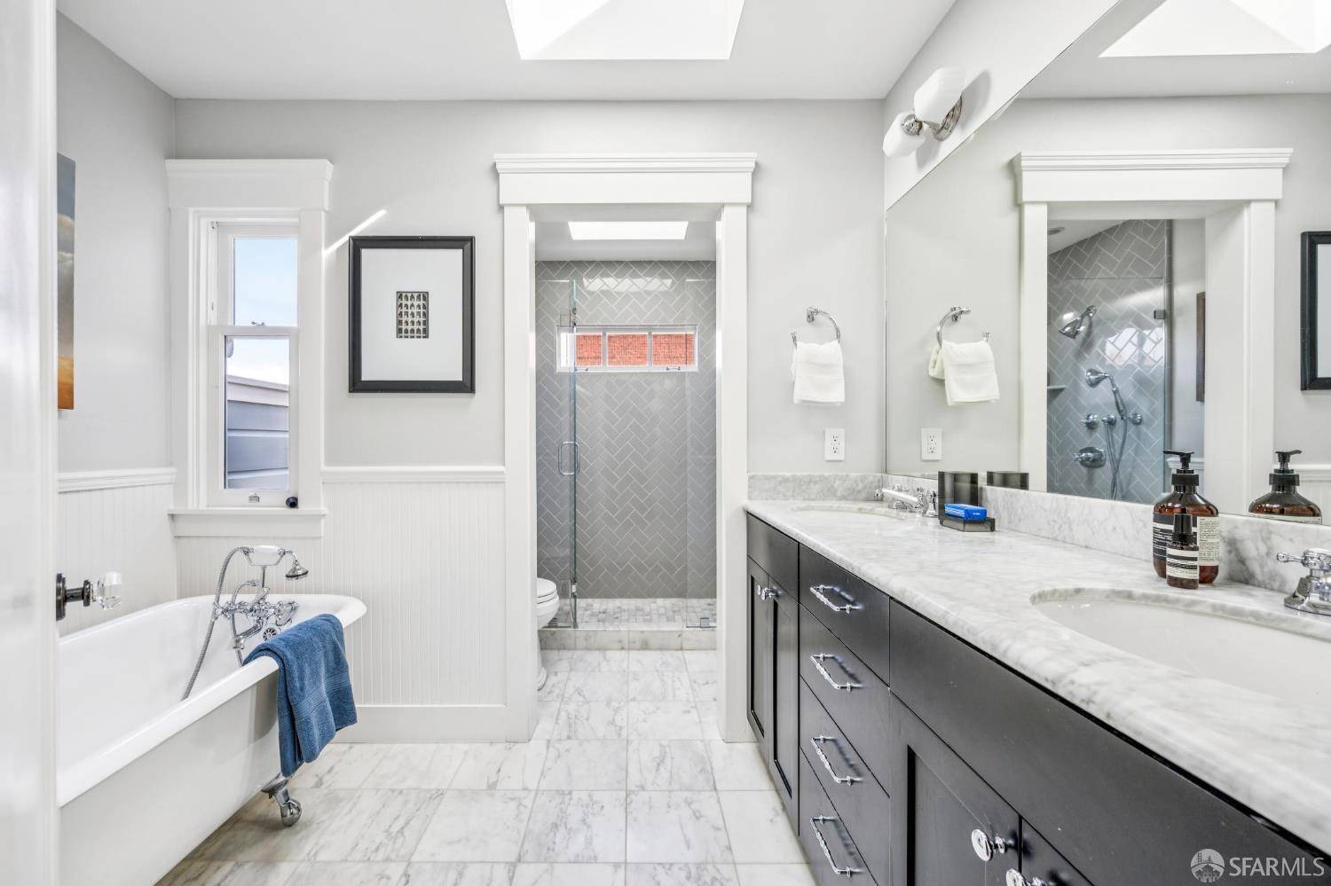 Perched above one of NOPA's most charming blocks, this light-filled Edwardian blends timeless SF character with modern energy. The airy living room features bay windows, custom cabinetry, and a Carrera marble fireplace. A Wolf range anchors the stylish chef's kitchen, complete with Eurostone counters and a quilted tile backsplash. Upstairs, the expansive en-suite retreat feels like its own worldwith a spa-like bath, clawfoot tub, and walk-in closet. A private rooftop deck captures skyline-to-Sutro views, perfect for morning coffee or sunset wine. Two-car parking, deeded storage, and a shared garden complete this perfect Panhandle perch.