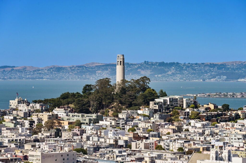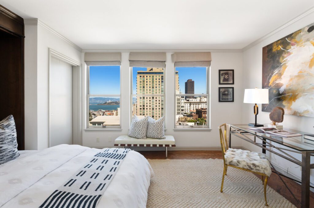 Down the hall from the entertaining rooms is a coat closet and double storage closet, as well as a laundry closet with a stacked washer and dryer. The south side of the unit houses three bedrooms and three bathrooms. The third bedroom can easily serve as a study with a built-in Murphy bed and bookshelves, and glorious views to the east of Coit Tower and the waters of the East Bay, Treasure Island, and downtown. Off the hallway is a third bathroom that serves well as a powder room for guests but hidden behind the door is a full marble shower. The second bedroom boasts a double closet and an ensuite marble bathroom with a rain shower and Toto Washlet toilet, as well as a balcony with views to the west over the city.