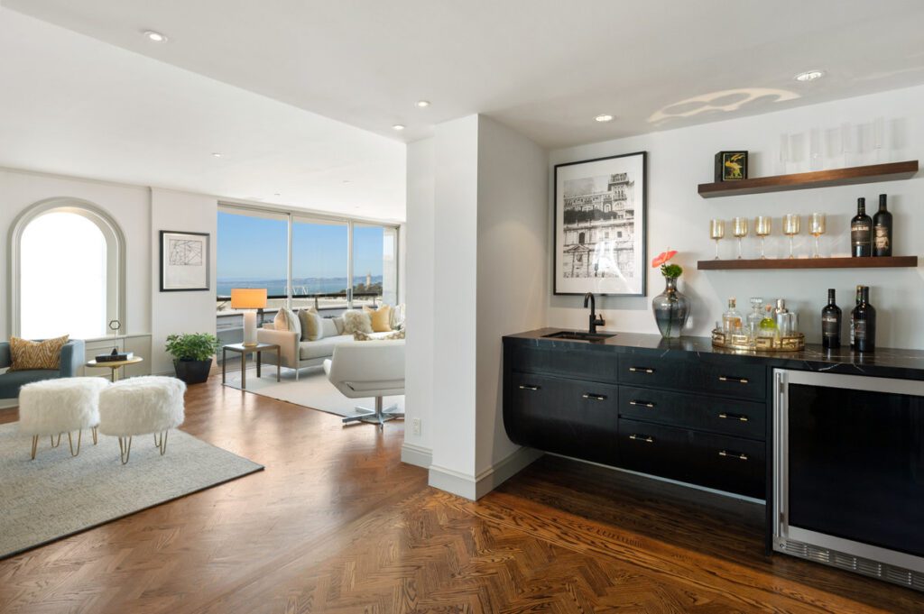 Spectacular Manhattan-style view condominium atop Nob Hill! An elevator opens directly to this full-floor flat displaying sweeping views of the San Francisco Bay, Golden Gate Bridge, Coit Tower, Treasure Island, and the downtown skyline from floor-to-ceiling sliding glass doors out to six balconies throughout the unit. The grand foyer presents rich herringbone wood flooring and an inviting wet bar with striking black quartz countertop with white veining and a wine refrigerator, Straight ahead is an inviting central seating area with a gas fireplace flanked by arched windows. To the right is the formal living room, centered around a built-in media console and bookshelves, with two balconies facing northeast to Coit Tower and the East Bay, and east to downtown landmarks including the Bay Bridge and Treasure Island. To the left of the entry is a dining room with two striking chandeliers overhead, a buffet area, and two more curved balconies with sliding glass doors. Stepping out on the northern balcony, one gets a view of the Golden Gate Bridge to the west and the waters of the Bay and Coit Tower to the east. The western balcony faces Sutro Tower and has a peek at the Golden Gate.