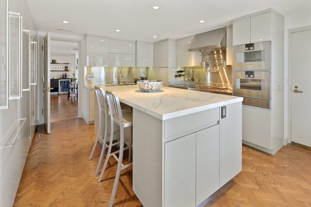 Accessible from the dining room and entry foyer is the gorgeous eat-in kitchen. Renovated with the finest materials and craftsmanship, the kitchen is equipped with custom lacquer cabinetry, Kessebohmer inserts and Blum Tandembox system drawers. Along the southern wall is a Gaggenau cooktop with stainless steel backsplash and pot filler, hood overhead, and Gaggenau double oven. Along the eastern wall are a stainless-steel sink and a Miele dishwasher. Along the back wall is a Gaggenau French door refrigerator and freezer, tall wine refrigerator, custom pull-out pantry cabinets, and a concealed wine rack cabinet, and has a pull-out that could serve as a baking center or allow for a third oven. In the center is a magnificent island, topped with Dekton countertops, with an overhang for informal dining.