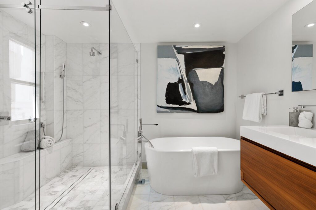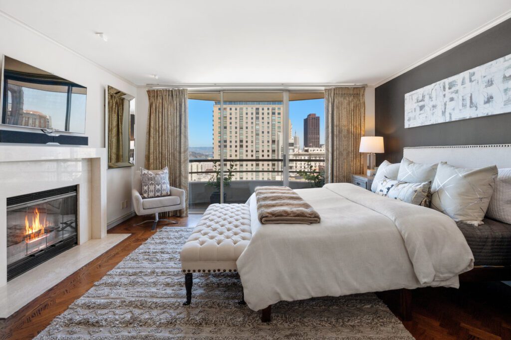 The luxurious primary bedroom is generous in size and includes a balcony and floor-to-ceiling windows that face a picture of the San Francisco landmarks: the beautiful Fairmont and Intercontinental Hotels, Grace Cathedral, the Salesforce Tower, Transamerica Building, and over to the Bay Bridge and Treasure Island. A built-in flatscreen and soundbar hang over a lovely fireplace and off the bedroom are two large walk-in closets. Past the closets is a luxurious primary ensuite bathroom, featuring a Toto Neorest toilet, a marble glass-enclosed shower with Graff fixtures, a separate soaking tub, and a floating double vanity.