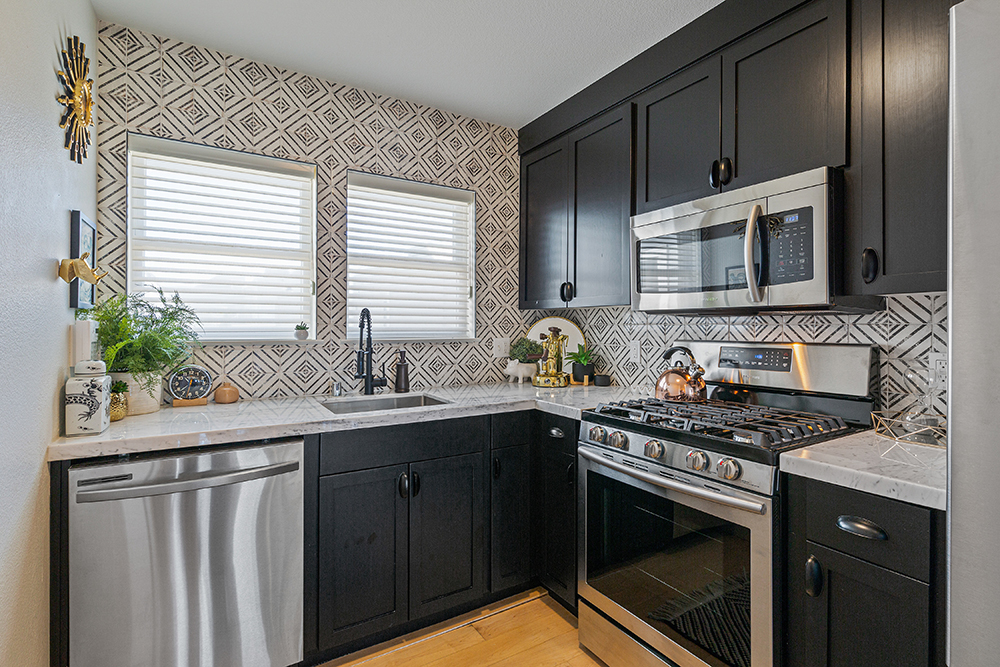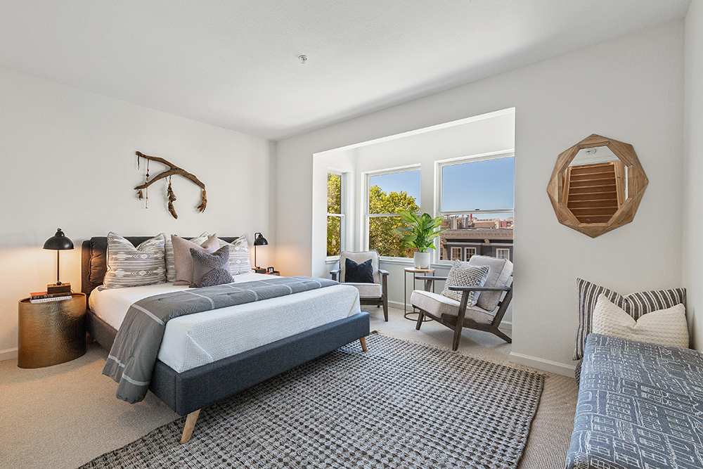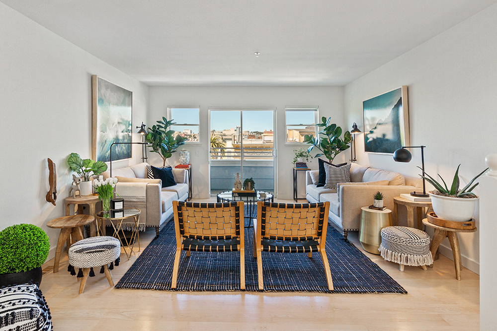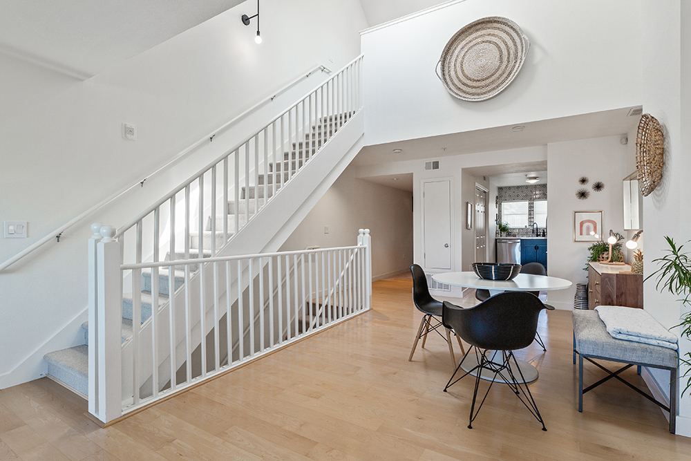 Spacious top floor condominium in the heart of the Upper Fillmore featuring great light, outdoor space, and a flexible open floor plan! Passing through a gracious entryway, the unit opens up to an expansive great room illuminated with light with wide-plank wood flooring. A formal dining area boasts double-height ceilings and is open to the main living room. Sliding glass doors lead out to a lovely balcony with city outlooks: the beautiful St. Dominic’s Church to the right and Sutro Tower to the left. Adjacent to the dining area is a modern kitchen, remodeled with sleek black cabinetry, gorgeous gray and white quartz countertops, and beautiful contemporary backsplash tile. The kitchen is equipped with stainless appliances including a dishwasher and gas range, a convenient pantry/storage closet, as well as a stacked washer/dryer in the laundry closet.