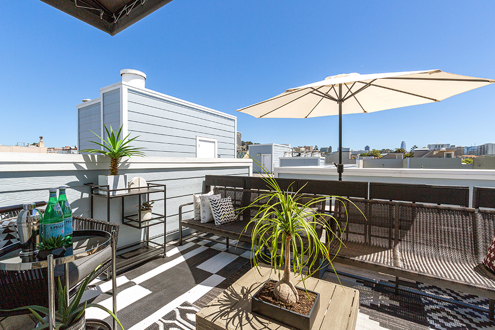 Up a flight of stairs is a den or office, partially open to the living room below, with glass doors opening up to a fantastic rooftop patio! This urban oasis is perfect for entertaining and outdoor dining, with space for seating, beautiful landscaping, and rooftop city outlooks including Salesforce Tower.
