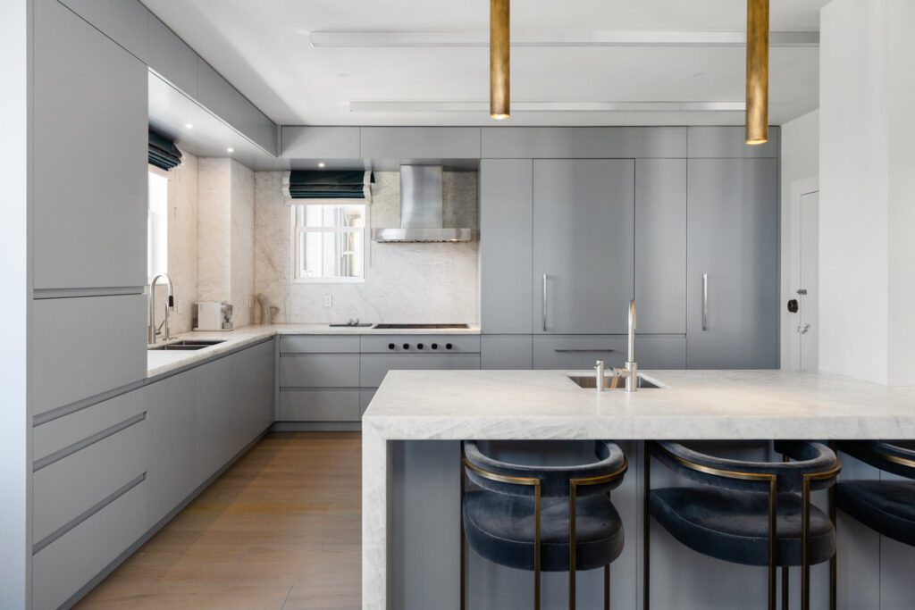 The home is surrounded by windows facing North, West and South that frame sweeping views of the Golden Gate Bridge, Alice Marble Park, the City and Bay. In the great room, circular window bays display the glittering waters of the Bay and Bridge views, and an open floorplan allows for family gatherings and grand entertaining. A seating area around a gas fireplace is adjacent to a striking formal dining area under Apparatus pendants. The gorgeous kitchen boasts a quartzite island and countertop, deluxe Miele and Wolf appliances, two sinks, and custom walnut cabinetry concealing an appliance garage and pantry closet. An extra-long island with overhang accommodates informal dining and houses a wine refrigerator and additional storage.