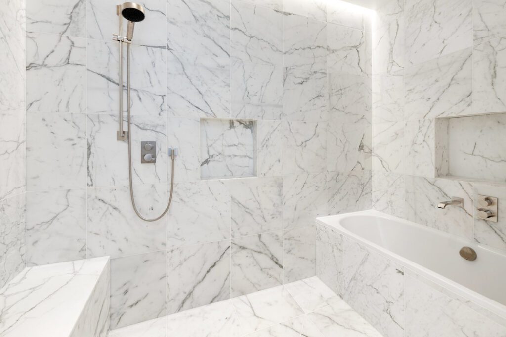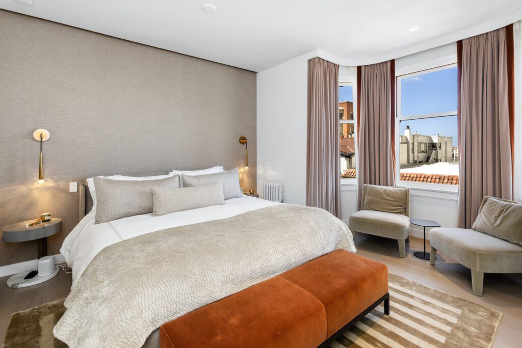 There are four bedrooms and three full bathrooms, including a luxurious primary suite. The primary bedroom has a seating area in a curved window bay that presents distant Golden Gate Bridge views, and a beautiful built-in headboard by Meridiani with Apparatus sconces. The sumptuous primary bathroom is outfitted with a custom Calacatta marble-topped walnut double vanity, Calacatta floor tiles, a rain shower with Calacatta surround, and a dramatic built-in Kaldewei tub. A generous second bedroom offers a circular window bay facing South, allowing the room to be flooded with light, and has an ensuite bath with a walk-in glass shower. Sizeable third and fourth bedrooms share a pristine marble hallway bathroom with a gleaming glass-enclosed rain shower.